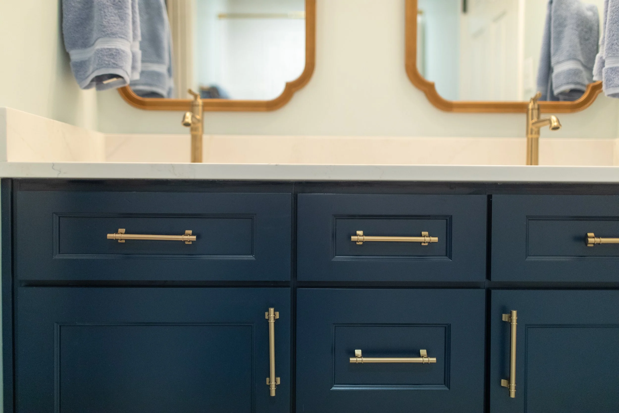 We converted this early 2000s bathroom to a retreat. Custom height cabinets in a special shade of blue, high end gold features and hand picked marble throughout.